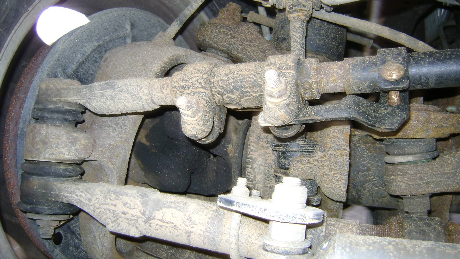 On the short trip you notice that the wheel is crooked. Pull the vehicle onto a clean surface and set the emergency brake. Loosen up these two clamps and turn the adjuster.